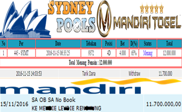Portal Berita Terkini ~ Kami keluarga besar Agen Judi Online MANDIRI TOGEL memberikan ucapan selamat kepada saudara Mexxie Lexxie Renxxxng yang beruntung mendapatkan Jackpot Togel pasaran Sydney Sebesar Rp.12.000.000. Hasil dari Result Pasaran Sydney hari ini dengan Nomor keluaran (9372) pada tanggal 15/11/2016 , 100% Tembus hanya dengan modal Rp.4.000 saja sudah bisa memenangkan hadiah sebesar Rp.12.000.000
