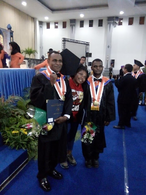 | Foto kedua wisudawan dan Adik Alince Gobai. temapt ruangan wisuda. |