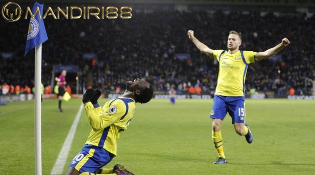 Pemain Everton, Kevin Mirallas mencetak gol tanpa dapat dihadang kiper Leicester City, Kasper Schmeichel pada laga Boxing Day Premier League di King Power Stadium, (26/12/2016). Everton menenag 2-0.