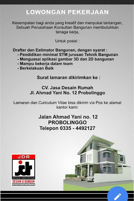Lowongan Kerja JDR Desain Bangun Probolinggo Kamis, 12 Januari 2017 Lowongan Kerja Kamis, 12 Januari 2017 Batas Lowongan Kerja sampai Akhir Januari 2017 // Tweet Subscribe to receive free email updates:
