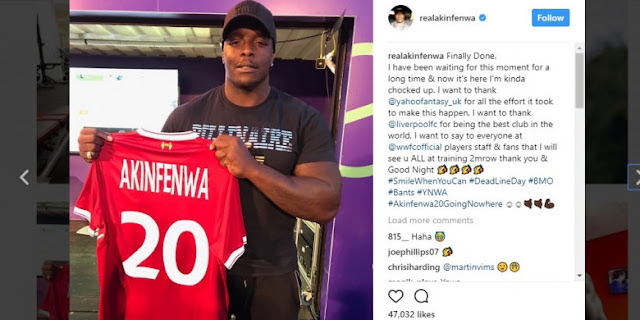 Bahkan pada hari terakhir bursa transfer, Akinfenwa sempat mengunggah foto dirinya memegang seragam Liverpool.