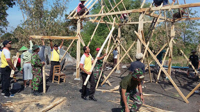 | Proses pendirian rumah secara gotong royong, mencerminkan kerukunan dan kerjasama lintas anggota baik sipil maupun militer. (foto: dok-ib) |